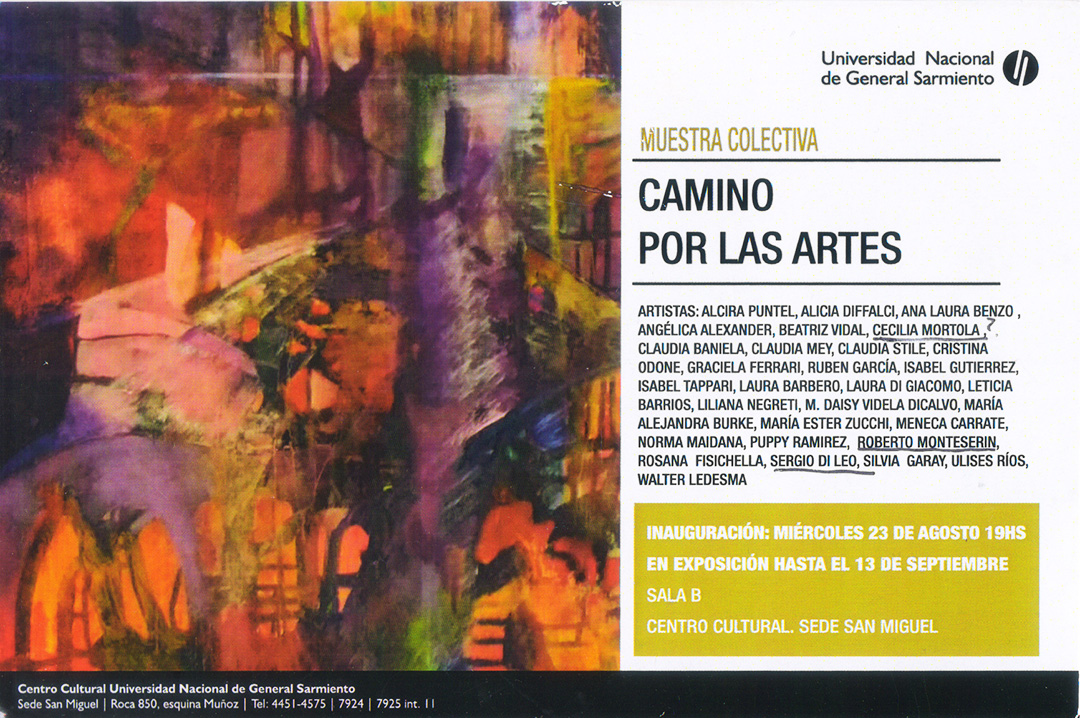 Muestra “Camino por las Artes” en la UNGS Fecha: 23 de Agosto al 13 de Septiembre 2017.Lugar: Centro Cultural de la Universidad Nacional de General Sarmiento (UNGS). Roca 850, San Miguel. Prov. de Buenos Aires. volver a exposiciones realizadas Enviar comentario Cancelar la respuestaTu dirección de correo electrónico no será publicada. Los campos obligatorios están marcados con *Comentario Nombre * Correo electrónico * Web